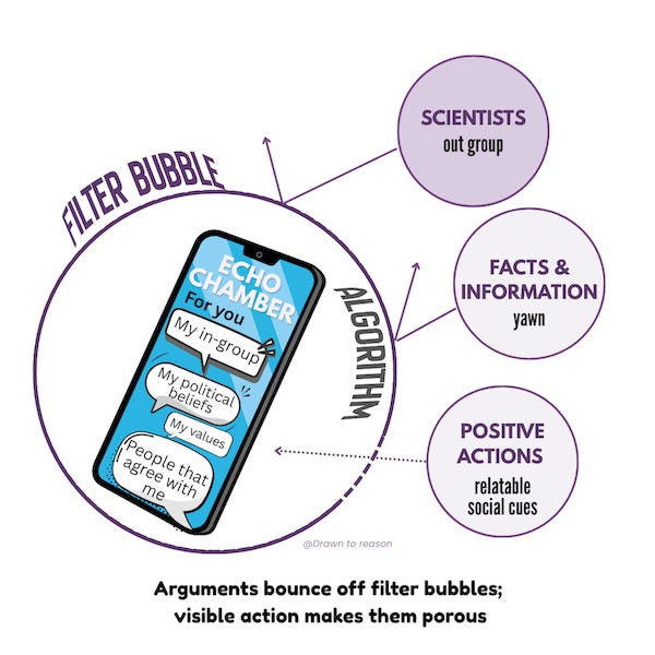 Whilst filter bubbles may be resistant to arguments, they may be more permeable to behaviour. Observed action functions differently from opinion: